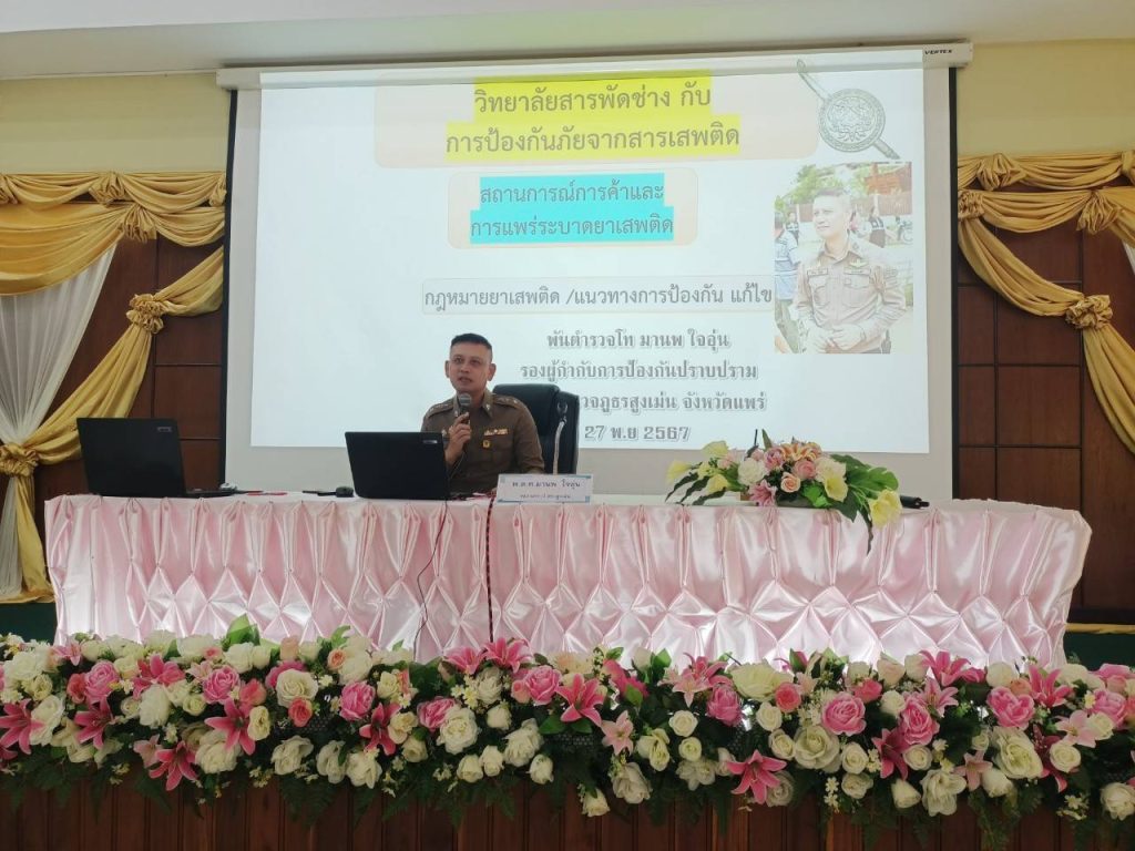 27 พ.ย พ.ศ.2567 เวลา 13.30น.-16.30น. โดยการอำนวยการของ พ.ต.อ.พงษ์พีระ การะเกตุ ผกก.สภ.สูงเม่น มอบหมายให้ พ.ต.ท.มานพ ใจอุ่น รองผกก.ปฯ ทำหน้าที่วิทยากร อบรมให้ความรู้ความเข้าใจ การป้องกันภัยจากสารเสพติด และแนวทางการป้องกัน แก่นักศึกษาวิทยาลัยสารพัดช่าง แพร่
