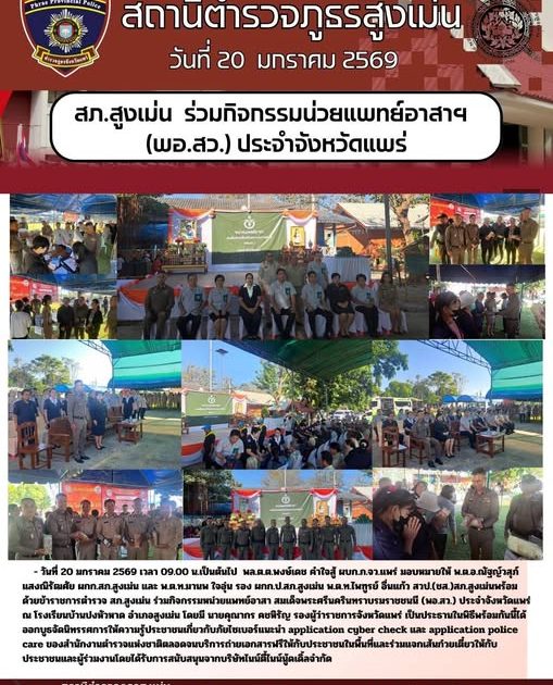 วันที่ 20 มกราคม 2569 เวลา 09.00 น.เป็นต้นไป พล.ต.ต.พงษ์เดช คำใจสู้ ผบก.ภ.จว.แพร่ มอบหมายให้ พ.ต.อ.ณัฐญ์วสุภ์ แสงณิรัฒศัย ผกก.สภ.สูงเม่น และ พ.ต.ท.มานพ ใจอุ่น รอง ผกก.ป.สภ.สูงเม่น พ.ต.ท.ไพฑูรย์ อื่นแก้ว สวป.(ชส.)สภ.สูงเม่นพร้อมด้วยข้าราชการตำรวจ สภ.สูงเม่น ร่วมกิจกรรมหน่วยแพทย์อาสา สมเด็จพระศรีนครินทราบรมราชชนนี (พอ.สว.) ประจำจังหวัดแพร่ ณ โรงเรียนบ้านปงหัวหาด อำเภอสูงเม่น โดยมี นายคุณากร คชหิรัญ รองผู้ว่าราชการจังหวัดแพร่ เป็นประธานในพิธีพร้อมกันนี้ได้ออกบูธจัดนิทรรศการให้ความรู้ประชาชนเกี่ยวกับภัยไซเบอร์แนะนำ application cyber checkและ application police care ของสำนักงานตำรวจแห่งชาติตลอดจนบริการถ่ายเอกสารฟรีให้กับประชาชนในพื้นที่และร่วมแจกเส้นก๋วยเตี๋ยวให้กับประชาชนและผู้ร่วมงานโดยได้รับการสนับสนุนจากบริษัทไนน์ตี้ไนน์นู้ดเดิ้ลจำกัด